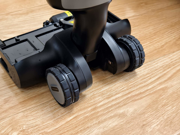 在机身背面,还加入了一个平躺助力万向轮,在洗地机平躺时起到支撑和助力的作用,也避免机身磨损。