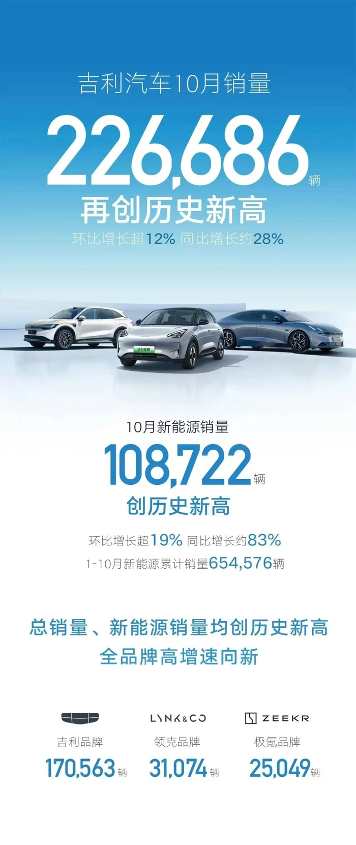其中,吉利 10 月售出超 22 万辆,新能源超 10 万辆,占比接近一半。长安自主新能源销量突破 8.5 万辆。2024 年前十个月新能源销量超 53 万辆,同比增长超 45%。