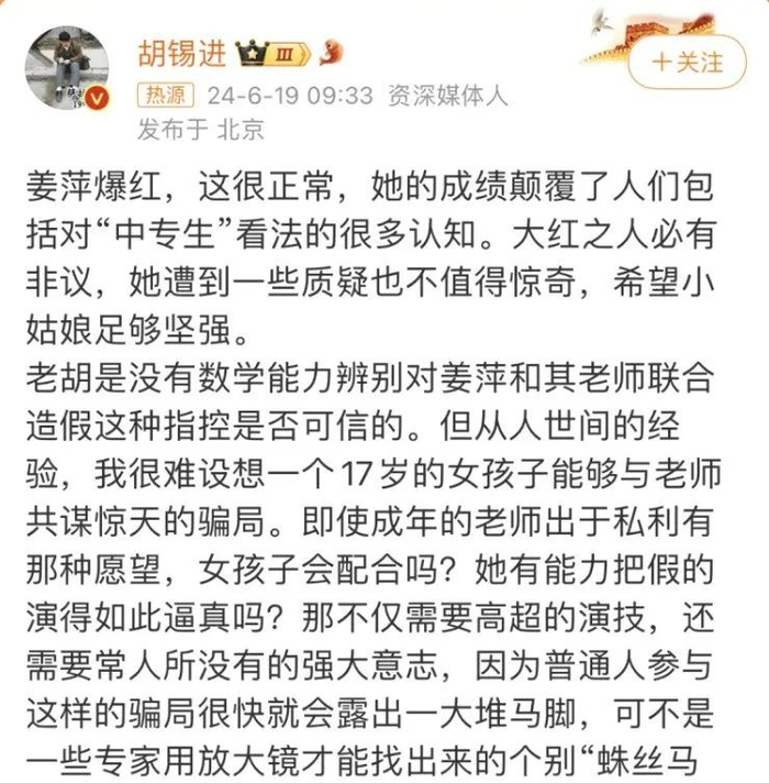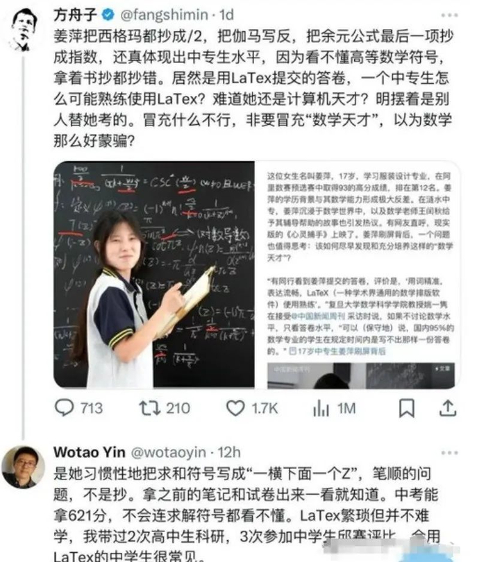 甚至当时达摩院数学竞赛的负责人印卧涛,都对姜萍的成绩深信不疑,还为此跟知名打假人方舟子争论过。