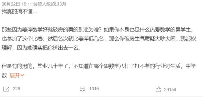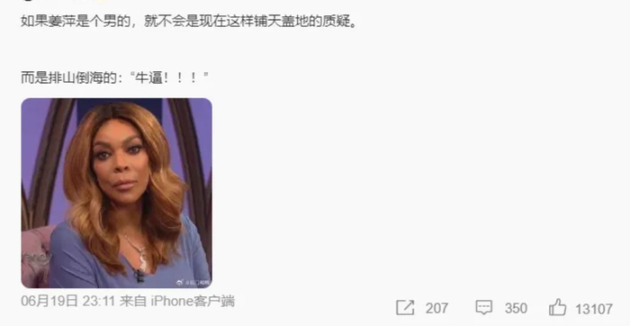 只要是质疑姜萍就被称为“男的破防了”、“如果姜萍是男的就没这么多事儿了”……