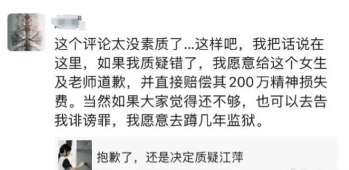 有数学竞赛教练,表示如果如果自己质疑得有错,愿意给姜萍 200 万精神损失费。