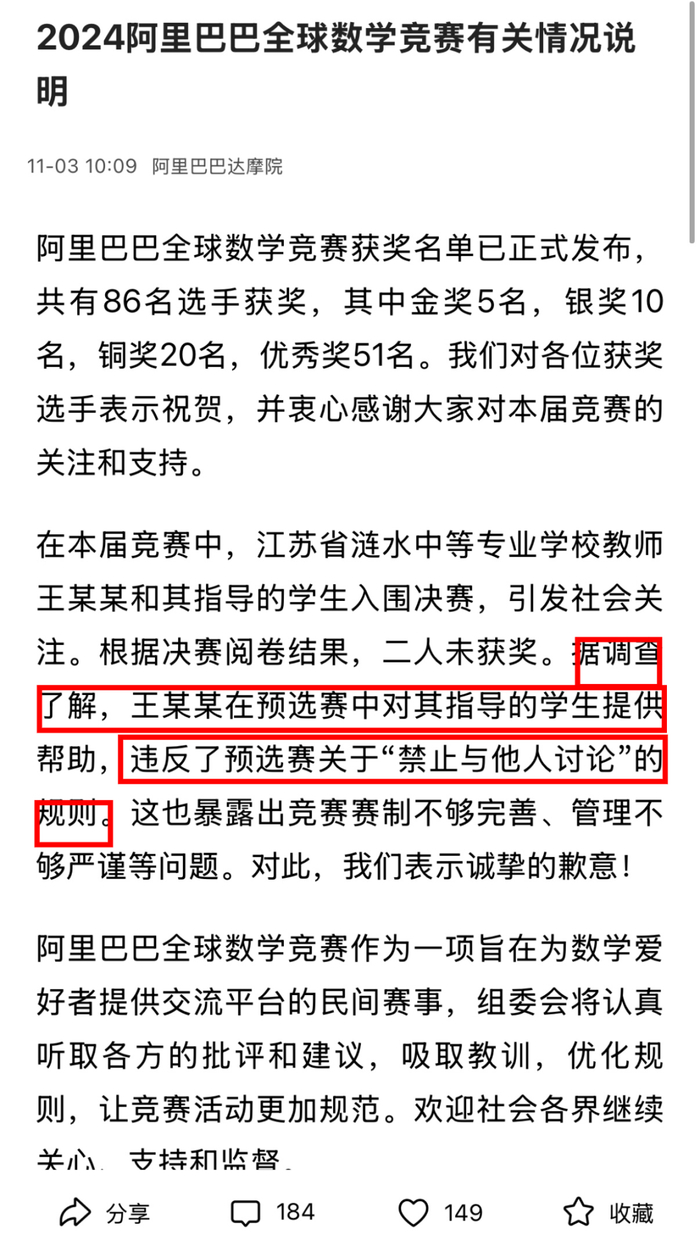 据调查,预赛中,王老师对姜萍同学进行了“指导帮助”,违反了预选赛关于“禁止与他人讨论”的规则,所以达摩院表示歉意。