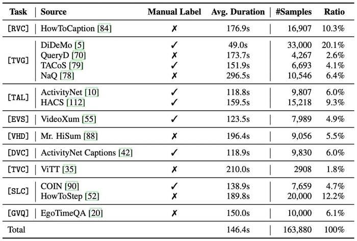 我们构造了E.T. Instruct 164K用于训练模型,如下表所示,它覆盖了来自14 个数据集的内容多样的事件级理解任务,包括时间定位、总结、亮点检测、密集描述和问答等。