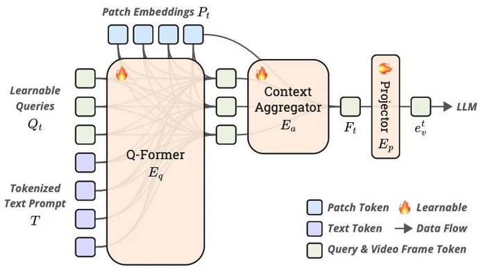 如下图所示,帧压缩器由一个具有可学习的随机初始化的query 的Q-Former ,一个上下文聚合器和一个投影层组成。在每个时刻,接受视觉Patch特征和文本提示作为输入,通过注意力机制将与用户提问相关的视觉信息聚合到中。然后,通过交叉注意力将与压缩合并为单个特征并经过投影层后转换到与LLM相同的特征空间中。