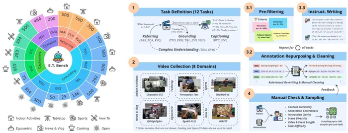 E.T. Bench的构建流程从定义事件级细粒度时序理解的四个基本能力开始,即1)指代,2)定位,3)密集描述和4)复杂理解。然后,我们精心挑选和设计了一系列专门用于全面评估上述每个能力的任务,并为每个任务筛选了带有人工标注时间戳的现有数据集,并根据任务所需形式将其原始标注重写为适合大模型评估的指令跟随格式。此外,我们尽量挑选了来自不同领域的变长视频,确保E.T. Bench 的多样性。最后,进行完备的人工检查,过滤和采样,以删除不符合预期的样本,确保E.T. Bench的高质量。