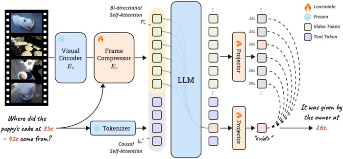下图展示了所提出的E.T. Chat的整体架构。给定在时刻采样的视频帧,首先利用视觉编码器将其转换为一系列视觉Patch特征,其中和分别是Patch数量和特征维度。为了保持高时间分辨率的视频帧输入,减少冗余计算以及不超出LLM的上下文长度限制,我们采用帧压缩器将视觉Patch集合压缩合并为单个特征,并投影得到最终输入LLM的视觉特征,其中是LLM的输入维度。最后,讲每个视频帧编码得到的集合与用户提问一起送入LLM里获取答案。