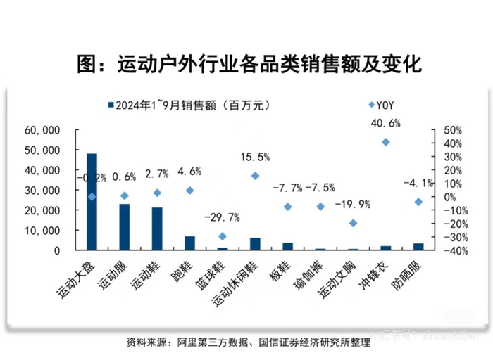 2023年被称为“冲锋衣元年”,2024年持续升温,从2023年8月至2024年9月,魔镜数据显示冲锋衣在主流电商平台销售额突破100亿元。另据国信证券研报,运动户外所有品类中冲锋衣的增长断崖领先,超过40%。瑜伽裤下滑,防晒服显颓势,最防风的冲锋衣,正在被时尚之风劲吹。