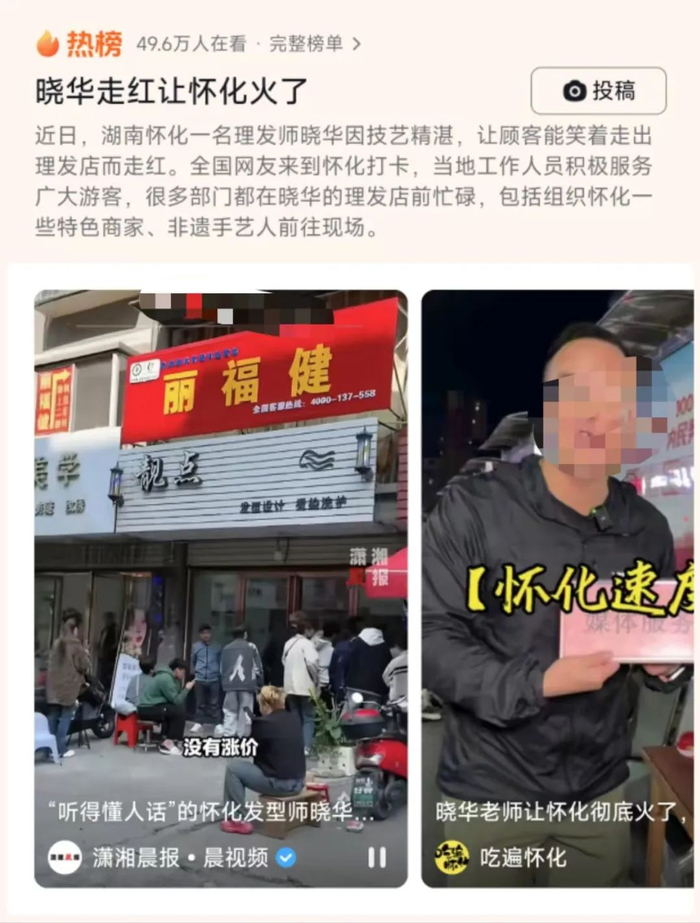 几天时间,晓华直接凭一己之力,让自己的小理发店火爆全网,更带火了湖南怀化文旅。
