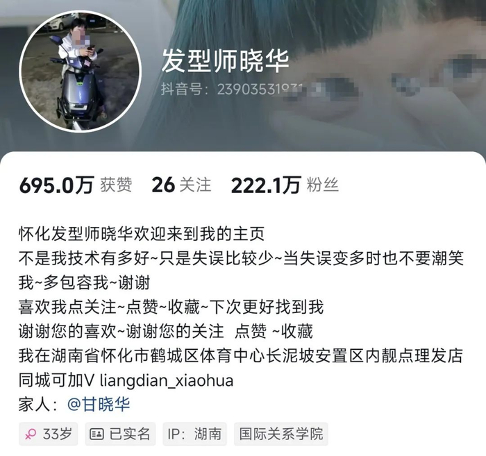 不知道你们刷到过她的视频没?@发型师晓华,根据她个人账号主页介绍可知,她是湖南怀化一家小理发店的发型师~