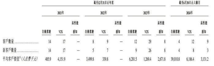 过去三年,公司自动驾驶的客户数量分别为14个、8个以及12个,起伏很大。同期,自动驾驶业务的平均客户价值则从48.6万元、350万元和620万元。到2024年上半年,这一数字增长到3901万元。