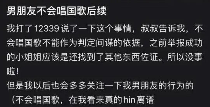 福建女子因男友不会唱国歌怀疑其为间谍,当即举报至相关部门…