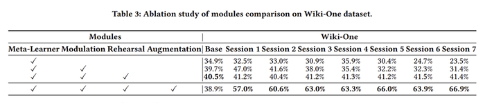 在Wiki-One数据集中,从基线的38.9%提高到了最后一个任务的40.05%,相对于其他的方法——随着更新的知识的学习,小样本性能也在下降,模型实现了对于更好的小样本学习性能的保持。