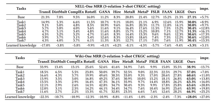 以NELL-One数据集为例,MRR指标相较于第一个task(11.1%),模型在最后一个任务中表现出11.35%的性能,期间最高达到12.55%。