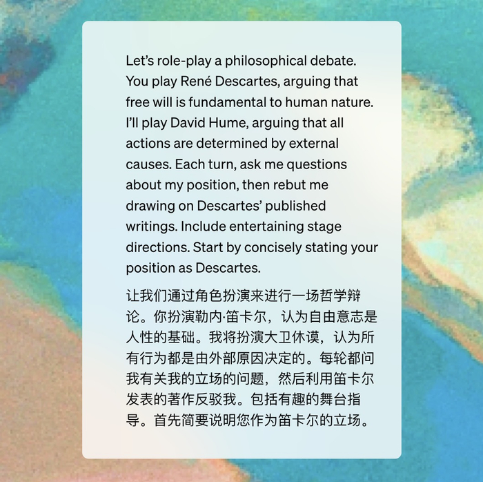 - 通过角色扮演进行哲学辩论,例如让ChatGPT扮演笛卡尔,学生扮演休谟,辩论自由意志的问题。