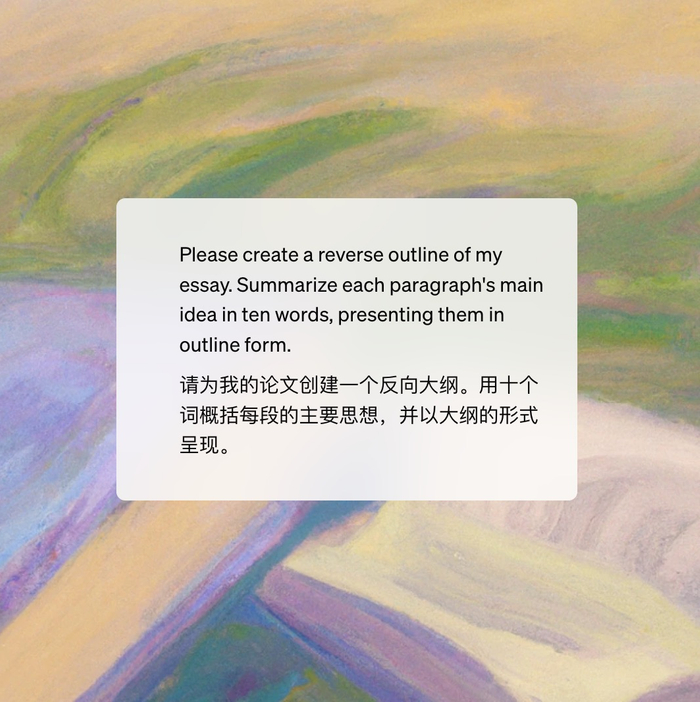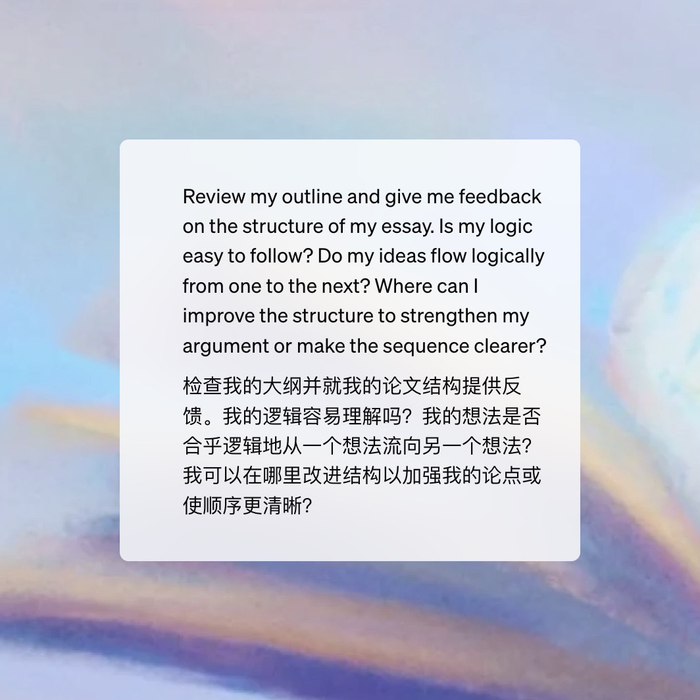 写作初稿后,ChatGPT 可以帮助学生审查文章结构,提出如何改进文章组织方式的建议。如果你已经写好了论文大纲,ChatGPT 可以帮助你检查文章各部分是否衔接得当,或者哪些地方需要进一步加强论证。