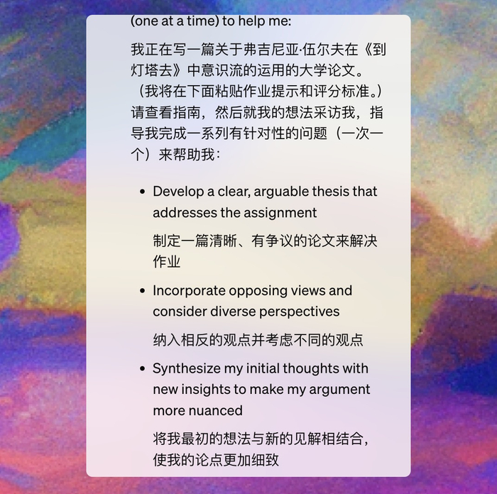写作不仅是为了交作业,它是提升批判性思维和写作技巧的一个过程。通过和 ChatGPT 互动,学生可以识别自己思维的盲点,并学会如何改进自己的论证。ChatGPT 可以帮助学生发现他们在写作中的常见问题,并提供策略,帮助他们在写作过程中持续进步。