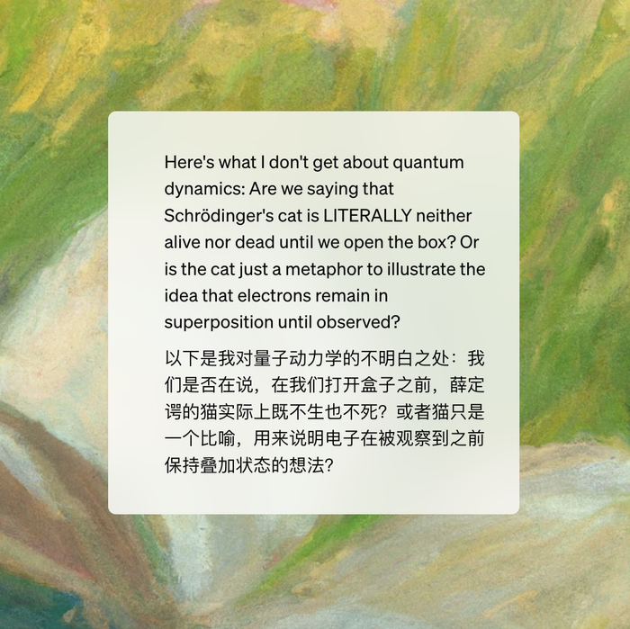- 询问关于量子力学的疑惑,例如“薛定谔的猫是字面上的既不活也不死吗?”从而理解超位置原理。