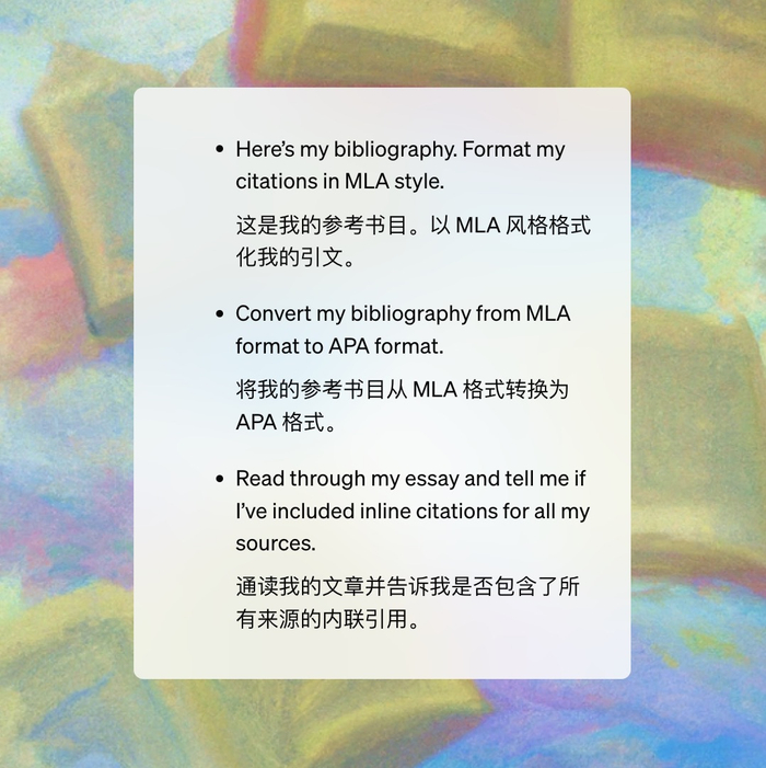 - 引用格式化:利用 ChatGPT 自动化引用格式的处理,节省时间,专注创意和论证。