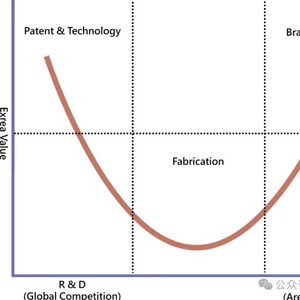 微笑曲线是 IT 相关制造业价值链不同组成部分的增值潜力的例证……根据施振荣的观察,在个人电脑行业,价值链两端的产品附加值都较高,而中间部分较低。如果用 Y 轴表示附加值、X 轴表示价值链(生产阶段)的图表来呈现这种现象,则所得曲线看起来像是在“微笑”。
