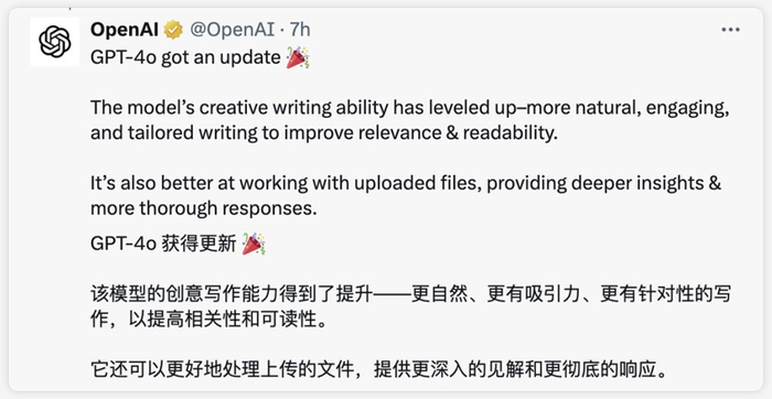 本次更新为 GPT-4o 带来更自然、更具表现力的创意写作能力。