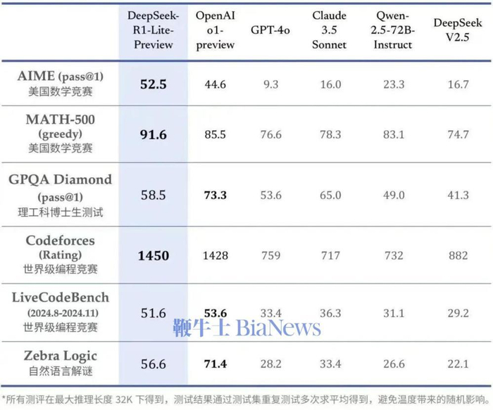 DeepSeek-R1在数学和编程方面与O1-preview相当,甚至在一些竞赛中已经领先O1。