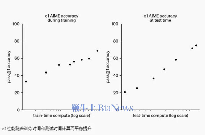 在OpenAI提供的O1模型后训练阶段的缩放定律图标显示,随着强化学习时间和推理思考时间的增长,O1模型性能得到显著提升。