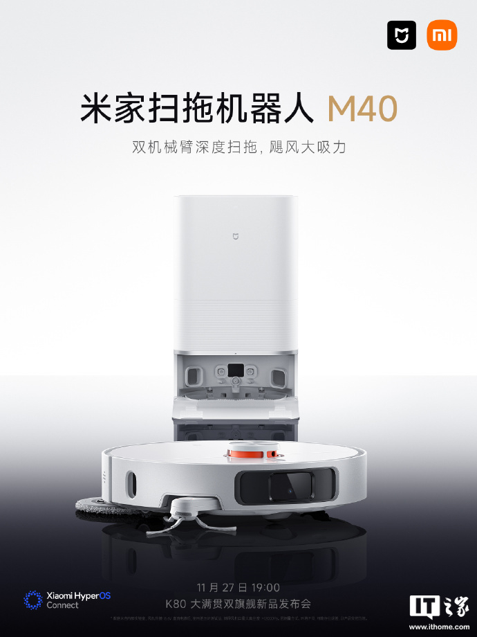 米家扫拖机器人 M40:创新双机械臂,扫拖皆可贴边清洁;12000Pa 飓风吸力,灰尘碎屑瞬间清理;实时毛发切割,落发、宠物毛不缠绕滚刷。