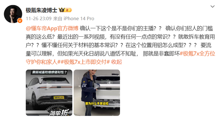 11 月 26 日晚,极氪智能科技副总裁朱凌在微博发文怒怼懂车帝主播及平台,朱凌认为:主播缺乏基本材料知识,质疑其专业性,并称其 “光天化日胡说八道,非蠢即坏”。
