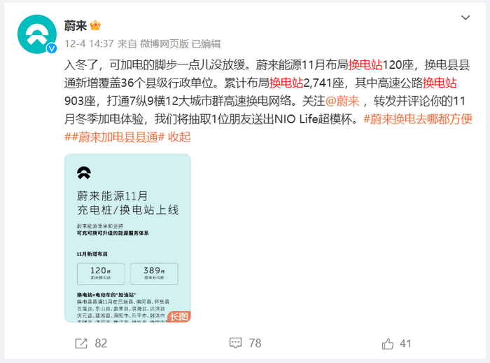 不止一位车主和股东表达了对蔚来管理层的失望。过去,换电是蔚来执行力超强的部门。2023年底,该部门管理层曾喊出2024年“建设千座换电站”的口号,但截至今年11月,进度不足50%。
