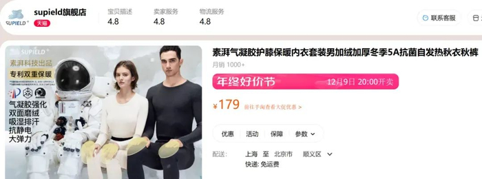 天猫旗舰店,一套5系素湃保暖内衣至少要179元。