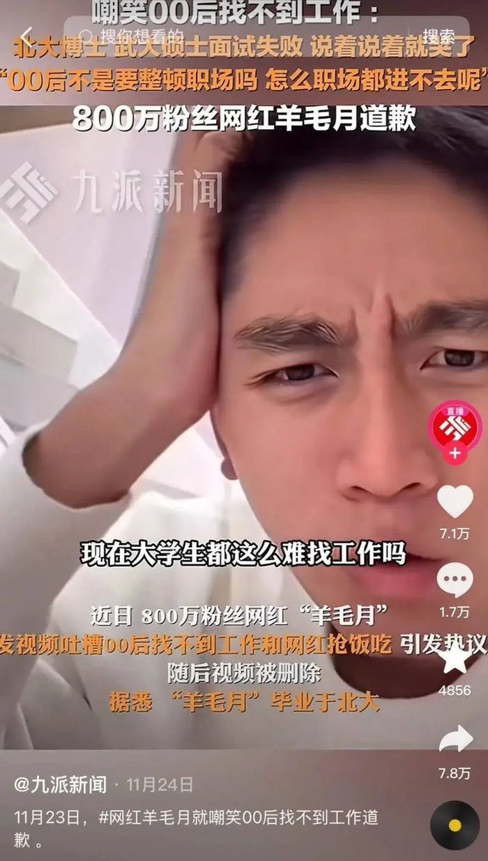 一个是羊毛月嘲笑00后找不到工作,疯狂掉粉百万;一个是张诗尧搞青海摇秋招,真正给年轻人就业岗位。