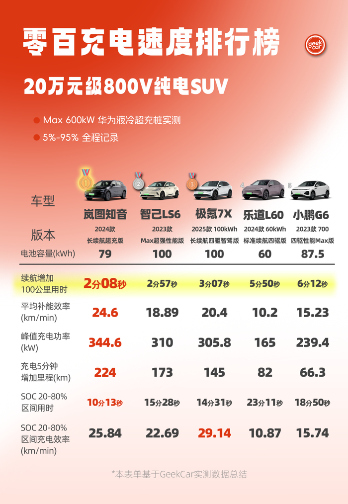12月12日,极客汽车发布了“20万级800V纯电SUV零百充电速度排行榜”。媒体针对岚图知音2024款长续航超充版、极氪7X2025款100kWh长续航四驱智驾版等5款热门纯电SUV的充电性能进行了测试。