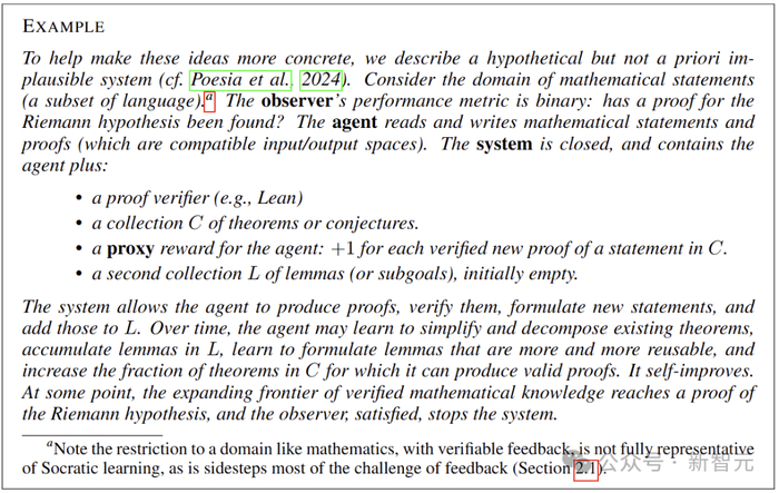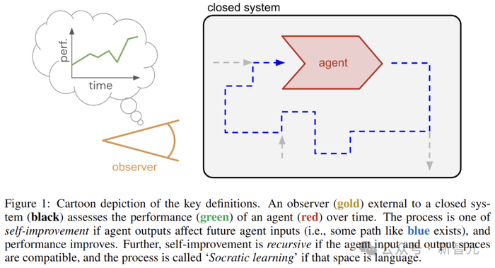 考虑蓝色虚线的路径,让智能体输出影响未来的智能体输入,并且性能得到提高(自我改进过程),如果输入和输出空间兼容,则这种自我提升是递归的。