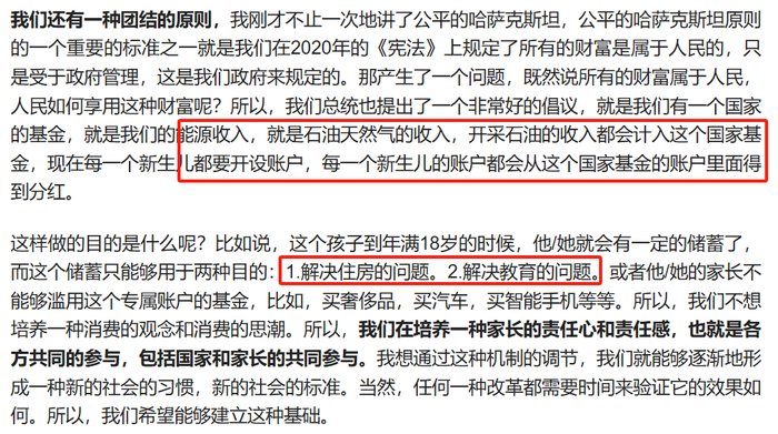 卡林接着谈到了哈萨克斯坦政府在推动人口政策时所采取的措施。他提到,哈萨克斯坦注重社会公平,努力让民众享受到经济发展带来的好处。为了鼓励年轻人尤其是年轻家庭生育,政府还实施了一些实际的经济支持政策。