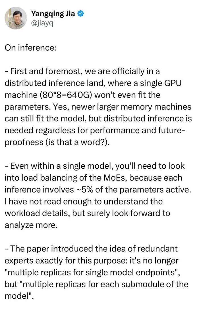 • 即使在单个模型中,也需要关注 MoE 的负载均衡,因为每次推理只有大约5%的参数激活。目前还没仔细研究这部分的工作负载细节,但应该会很有趣。