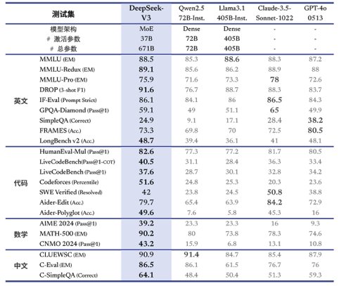 “我们对DeepSeek-V3 进行了全面的基准测试。尽管 DeepSeek-V3-Base 的训练成本较低,但综合评估表明,DeepSeek-V3-Base 已经成为目前可用的最强大的开源基础模型,特别是在代码和数学方面。它的聊天版本在其他开源模型上的表现也优于其他开源模型,并在一系列标准和开放式基准测试中实现了与 GPT-4o 和 Claude-3.5-Sonnet 等领先闭源模型的性能相当。”
