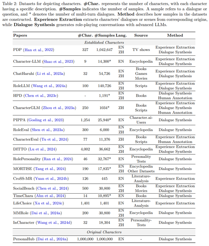 获取这些人格数据的方法包括:在线资源收集(如从维基百科等获取知名角色信息)、自动提取(用LLM从书籍等材料中提取对话)、对话合成(用更强的LLM创建和扩展角色扮演对话数据集)以及人工标注(由标注者或角色粉丝创作高质量的角色扮演对话)。