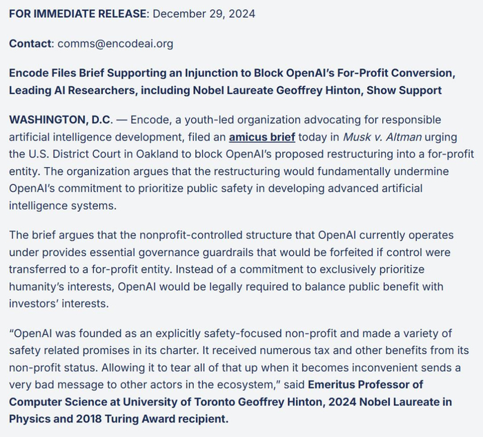 Encode 是一家非营利组织,曾参与发起加州 SB 1047 人工智能安全立法。该组织提供的陈述支持伊隆・马斯克提出的禁令,旨在阻止 OpenAI 向营利性公司转型。