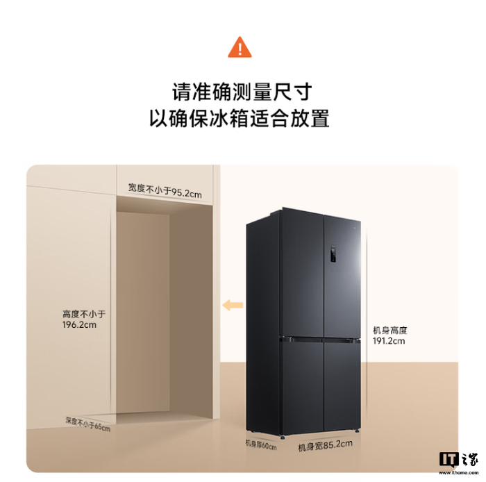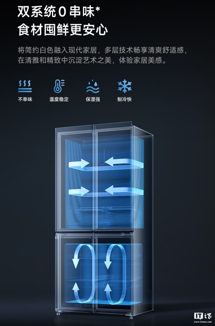 据介绍,小米米家冰箱巨能装 Pro 十字 513L 墨羽岩支持双系统双循环,宣称具备“不串味、温度稳定、保湿强、制冷快”特点。冰箱机身厚度约 60cm、占地面积约 0.62m²。