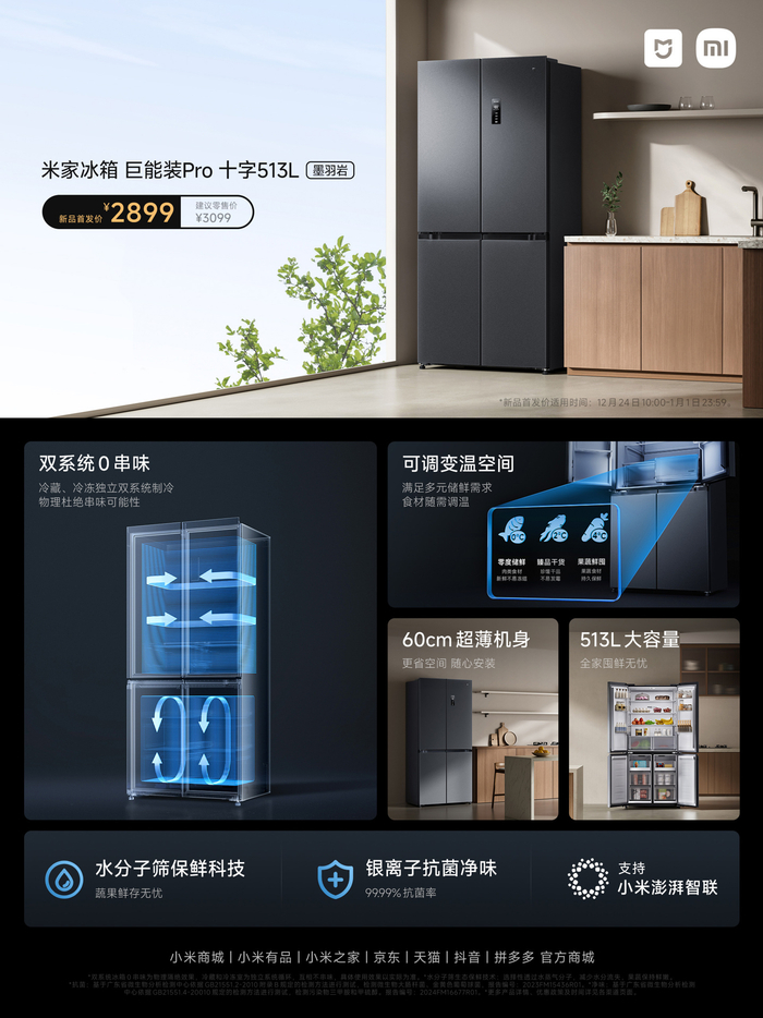 IT之家 1 月 1 日消息,小米米家冰箱巨能装 Pro 十字 513L(墨羽岩)今日开售,拥有 60cm 机身、支持冷藏冷冻独立制冷,定价 3099 元,首发 2899 元。