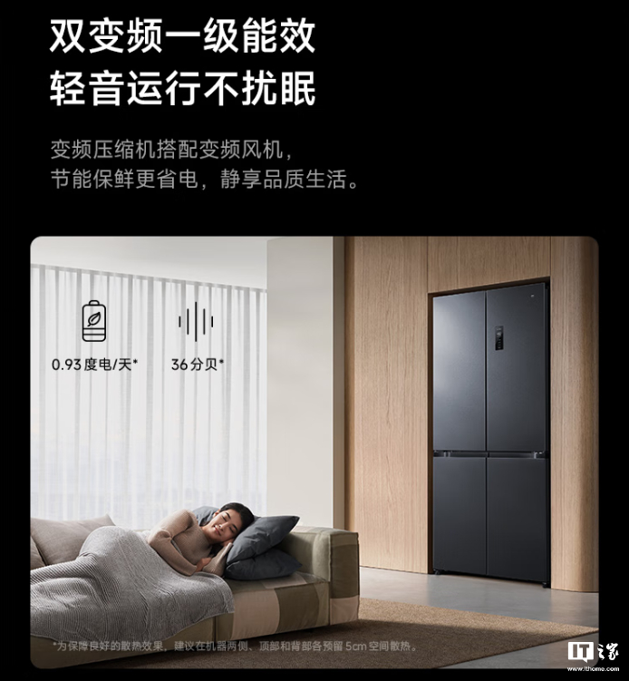 小米米家冰箱巨能装 Pro 十字 513L 墨羽岩拥有双变频一级能效(变频压缩机搭配变频风机、0.93 度电 / 天、36 分贝噪音),接入米家 App、支持小米澎湃智联、小爱同学语音控制、OTA 在线升级等功能。