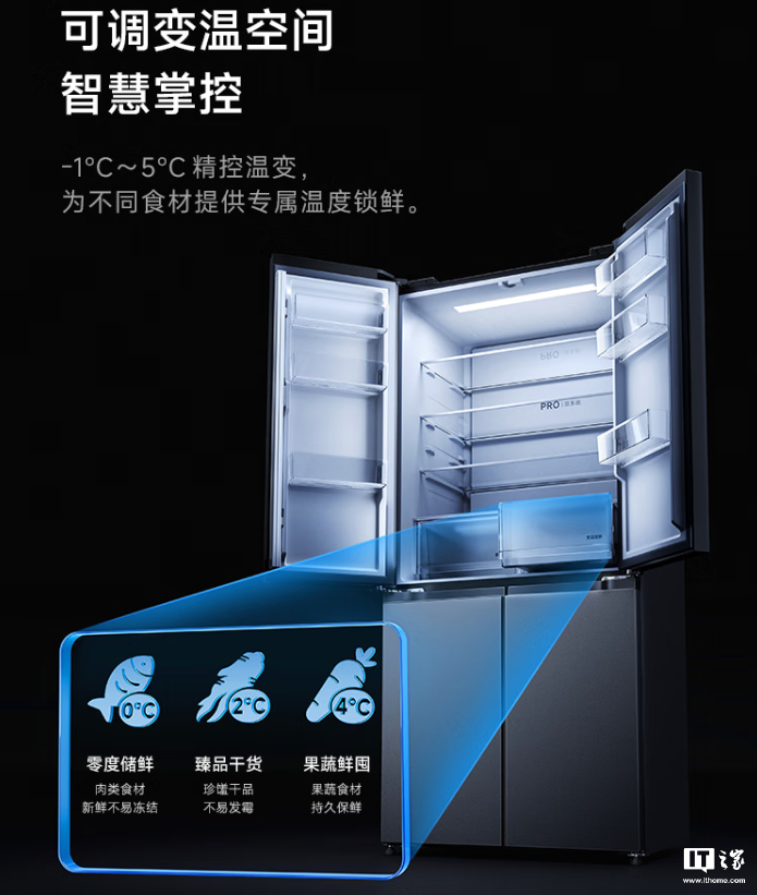 该款冰箱拥有 513L 容量(301L 冷藏区、183L 冷冻区、29L 变温空间),采用十字精储设计、配备 18 格独立分区。冰箱可调变温区支持-1℃~5℃温变、保湿抽屉内置生态保湿膜。