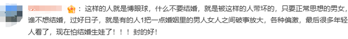 “ 这样的人就是博眼球,什么不要结婚,就是被这样的人带坏的,只要正常思想的男女,谁不想结婚。 ”