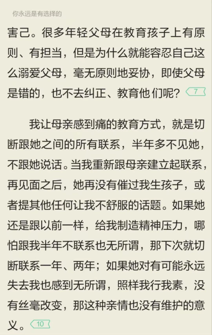 “ 我让母亲感到痛的教育方式,就是切断跟她之间的所有联系,半年多不见她,不跟她说话。当我重新跟母亲建立起联系,再见面之后,她再没有催过我生孩子,或者提其他任何让我不舒服的话题。”