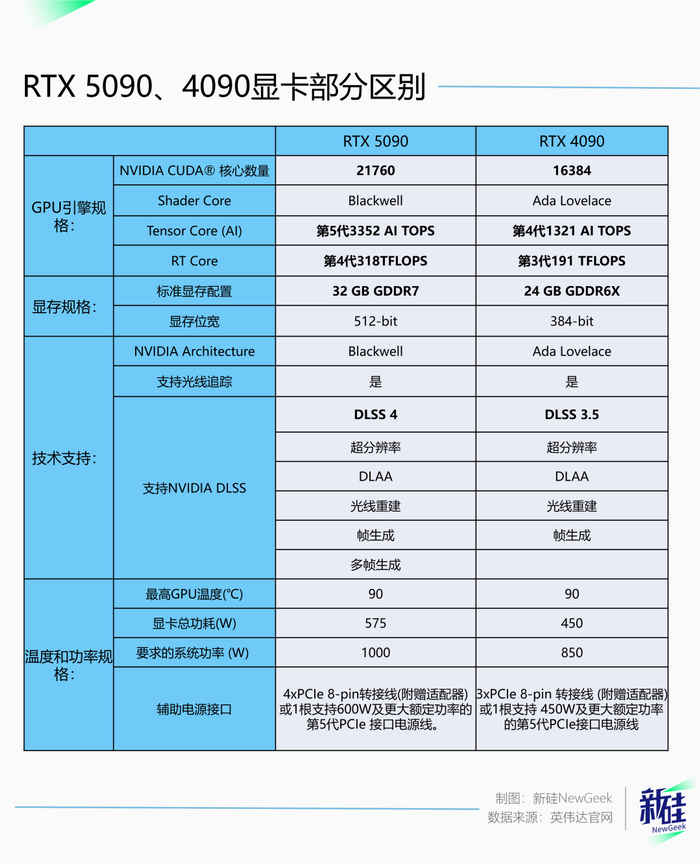 50系列显卡之间等级分明,50系列相较于40系列显卡在架构、显存等方面都有升级,以5090和4090为例。