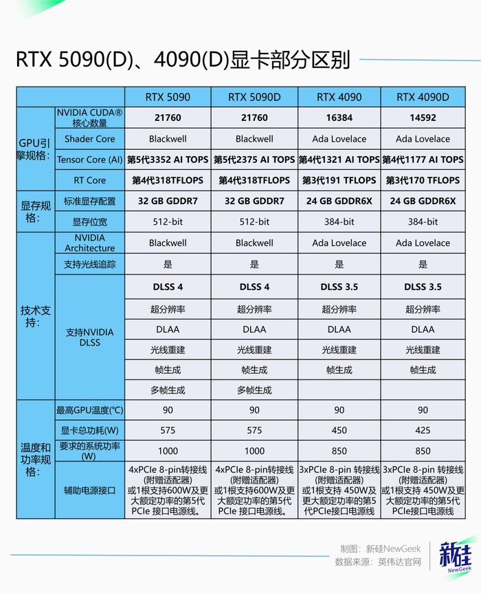 这也直接导致了在国内只能买到阉割版的4090D。英伟达把4090D的CUDA核心从16384个减少到14592个,总功耗也从450W降至425W,才勉强通过了美国的限制。