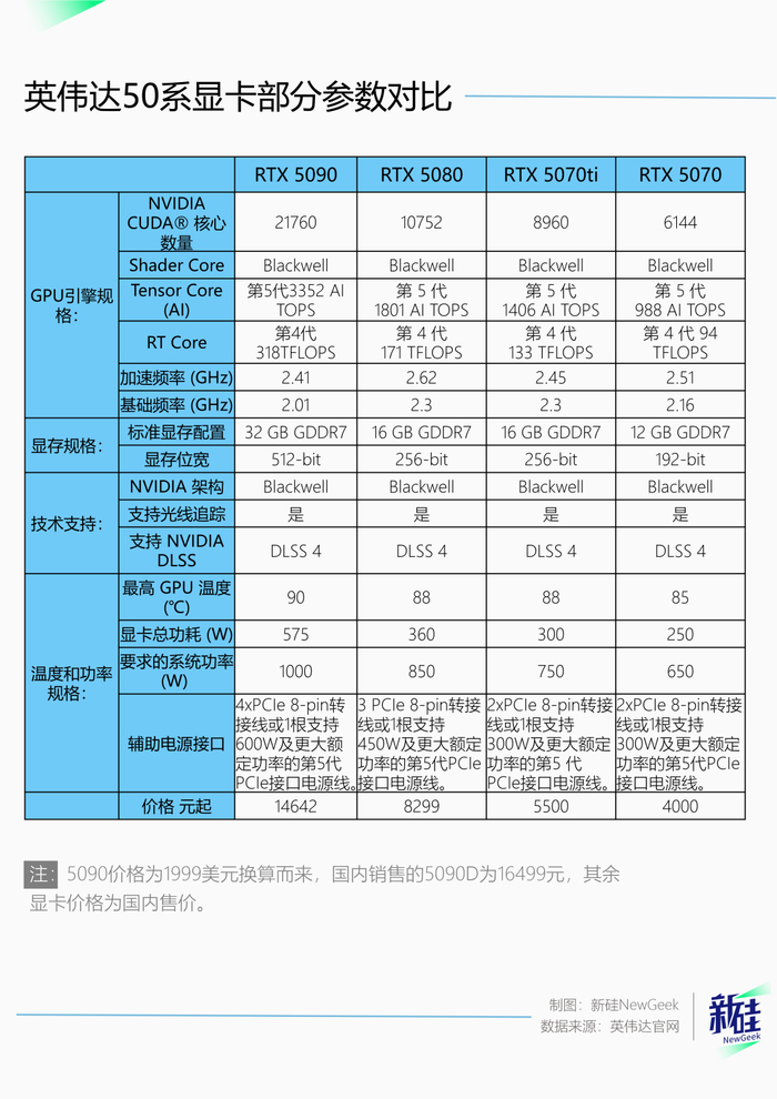 5090作为新一代卡皇,无论是在CUDA核心、Tensor Core等核心参数上都远超其他产品。但同时5090的价格几乎为5080的2倍,价格为1999美元,约合人民币14642元。