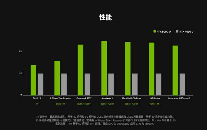 然而,英伟达显卡在游戏方面还有一个卖点:DLSS技术。英伟达使用深度学习算法在较低的分辨率下渲染游戏画面,然后通过Tensor Core把图像放大并提升质量。5090D的Tensor Core低于5090,那么在DLSS方面会有所落后,但同样的,5090D还是高于4090的。