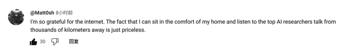 用油管评论区底下网友的话来说,“现代互联网的无价之宝,就是我们可以坐在家里听几千公里的顶级 AI 科学家讨论事情。”(对中国来说是 14,000 多公里)