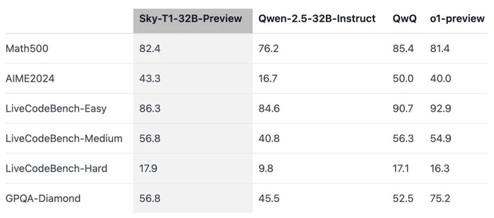 Sky-T1 在 MATH500(「竞赛级」数学挑战)上的表现优于 o1 的早期预览版本,还在一组来自 LiveCodeBench(一种编码评估)的难题上击败了 o1 的预览版本。然而,Sky-T1 不如 GPQA-Diamond 上的 o1 预览版,后者包含博士毕业生应该了解的物理、生物和化学相关问题。
